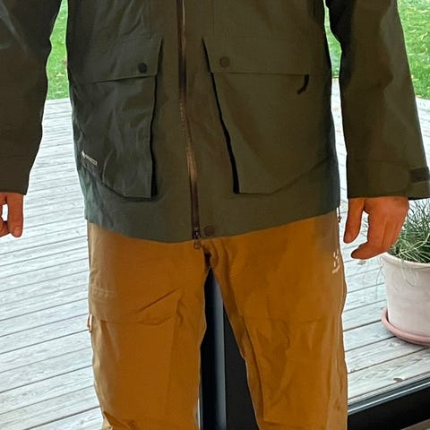 Haglöfs bukser i størrelse M til mænd, fremstillet i orange polyester. Bukserne har forstærkede områder ved benene og er designet til udendørs brug. Kun brugt på en enkelt skitur. Seler medfølger og kan påsættes bukserne hvis ønsket.