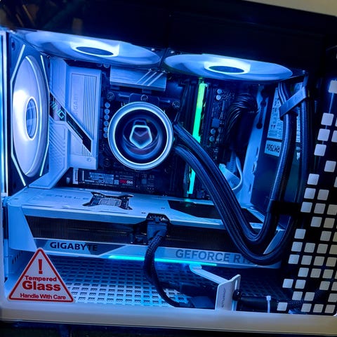 RTX 4090, Ryzen 7800X3D, 64 GB 6000 MHZ, Lian Li CPU Vandkøling med Skærm, Aorus motherbord, 1000W SFX Corsair strømforsyning, Jonsbo kabinet med skærm, Div Lian Li Kabinet fans, brugt få timer da jeg ikke har haft tid til at bruge den.
