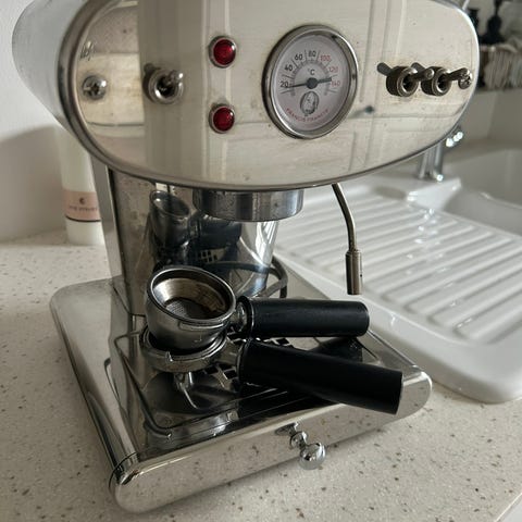 Der følger forskellige håndtag med, så man kan lave ægte espresso og pads. Jeg har afkalket maskinen med det medfølgende citronsyre samt alm. Eddikesyre en gang imellem, det fungerer fint.