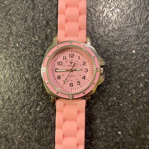 Ovenpå urskiven er en fin krone af sølv med pink sten.