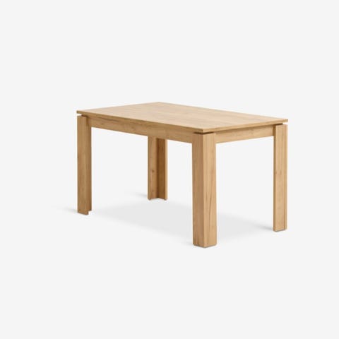 Jysk spisebord fremstillet i egetræ med sort metalstel. Bordpladen har en naturlig træstruktur og en midterfuge, der kan åbnes for at tilføje en tillægsplade. Bordet er egnet til spisestue eller køkken og har en moderne, enkel stil.