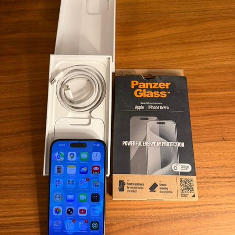 Apple iPhone 15 smartphone med 128 GB lagerplads. Enheden har en sort farve og leveres med et beskyttelsescover. Virker som den skal. Sælges udelukkende grundet opgradering.