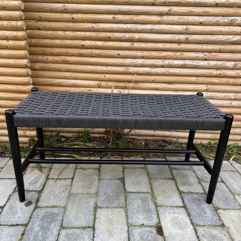 Sædet er lavet af naturfarvet flet, der giver en varm og indbydende følelse. Det massive egetræ i benstellet er matlakbehandlet, som fremhæver træets naturlige skønhed og giver bænken en robust stabilitet.
