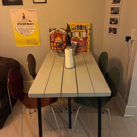 Spisebord med ben af stål malet brun (se billeder), rektangulær topplade af fineret egetræ. H. 74 L. 180 B. 87 cm. Fremstillet for HAY. Model Loop. med lette brugsspor, mindre trykmærke på et hjørne