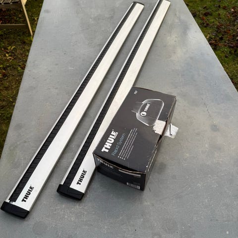 Fodsæt (model 710600) til nedfældende tagrælinger samt to stk 118 cm Wingbar Evo (model 711200) sælges grundet køb af ny bil. Fungerer upåklageligt. Har været monteret på en Seat Leon Stationcar.