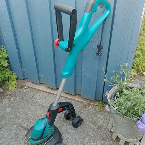 Bosch elektrisk græstrimmer med ledning, designet til præcis græsklipning. Udstyret med justerbart håndtag og letvægtskonstruktion for nem håndtering.