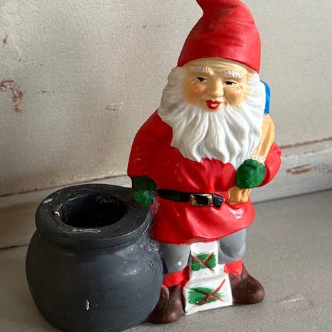 Skøn gammel nisse i keramik med lanterne - læner sig op af en træstub. Så fin en nisse!