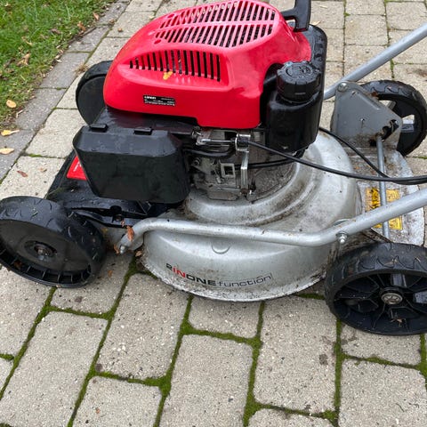 Al-Ko græsslåmaskine (benzindrevet) med hjul og håndtag. Designet til at klippe græs effektivt. Farve: grå med røde detaljer. Der er et lille hul på toppen på grund af rust, men den fungerer meget fint og uden problemer.