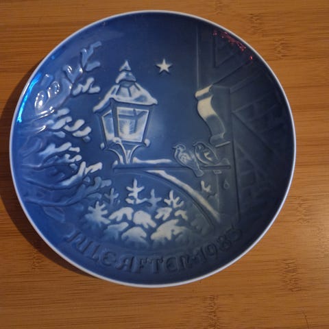 Bing & Grøndahl Juleplatte fra 1970 med blå og hvid porcelæn, dekoreret med et vinter- og julemotiv. Tallerkenen er rund og egnet til samling eller dekoration.
