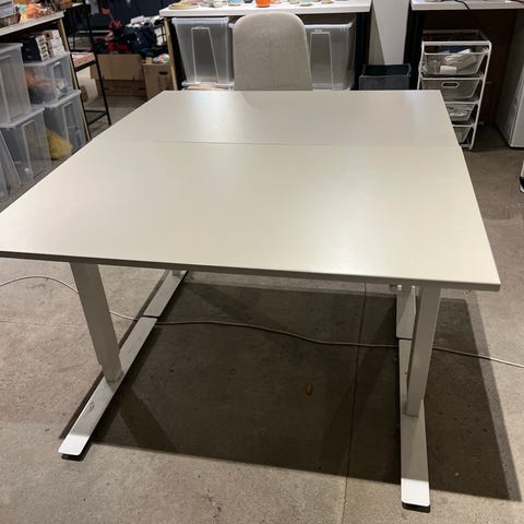 Brugt IKEA skrivebord i dur med dette: https://kontorzonen.dk/vare/ikea-skarsta-manuelt-haeve-saenkebord-120x70-cm-hvidt/