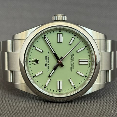 Rolex Oyster Perpetual 41 ref. 134300 med den nye grønneskive skive. Uret er fra OKT 2025 og fremstår som ny. Den iøjnefaldende grønne skive er blandt de mest eftertragtede farver i OP-serien. Et perfekt hverdagsur med automatikværk og 100 meter vandtæthed. Leveres med den nye grønne boks, papirer og certifikat og 5 års worldwide garanti fra Rolex.