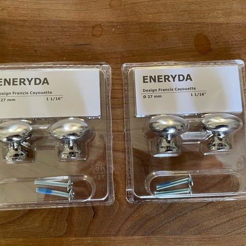 6 nye IKEA ENERYDA knopgreb i traditionel stil, i aluminium med skruer. Størrelse 27 mm. Flot og moderigtig. Sælges alle 6 samlet for 100 kr.