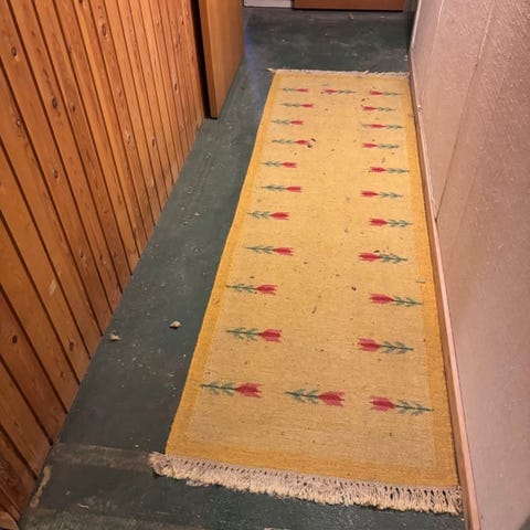 Kelimtæppe - det er lidt sol/lys bleget, og er lidt uens i farven.