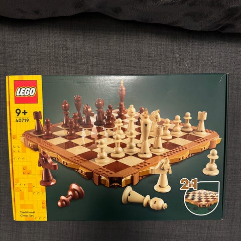 LEGO skakspil med brikker i sort og hvid. Spillet består af en skakbræt og tilhørende brikker, der kan samles og skilles ad. Materialet er LEGO-klodser, og spillet er designet til at blive brugt som et traditionelt skakspil. Derudover medfølger to sæt Dam brikker samt ekstra klodser.
