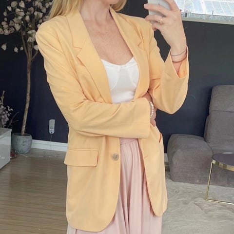 Klassisk let blazer i hørblanding fra H&M. Perfekt til både hverdag og arbejde – kan styles afslappet med jeans eller mere formelt over en kjole/skjorte.
