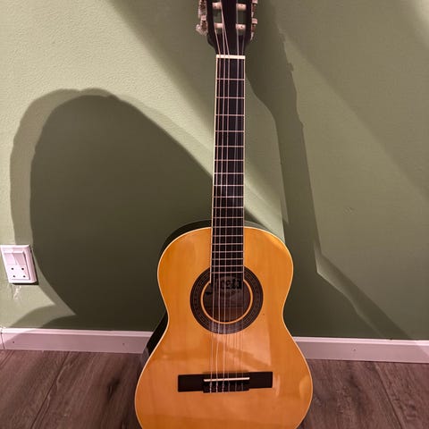 Akustisk guitar med trækrop og seks strenge. Guitaren har traditionel form og manuel stemmeskruer. Velegnet til akustisk musik og øvelse.