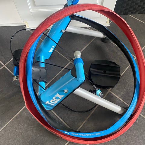 Den er til påmontering af egen racercykel. Special dæk til formål følger med. Virker fint og fylder meget lidt sammenklappet. Fed træningsudstyr til de mørke og kolde dage.