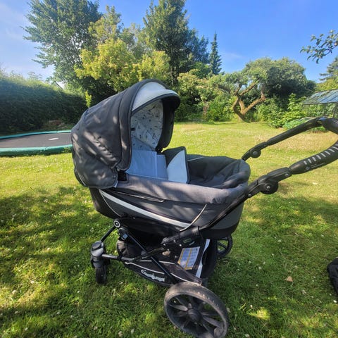 Emmaljunga kombineret barnevogn og klapvogn i 1 i mørkeblå farve med polstret indvendigt betræk.