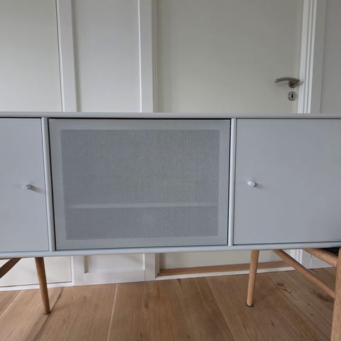 Væghængt Montana TV-reol med to låger og perforeret klaplåg. Som ny. Inkl. vægophæng. Købt februar 2025.