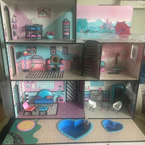 L.O.L. Surprise legetøjshus med flere rum og skuffer, designet i pink og guld farver. Legetøjshuset har detaljerede illustrationer indvendigt, der forestiller forskellige rum og møbler. Velegnet til opbevaring og leg med små dukker og tilbehør. Der følger 5 LOL dukker med. Det er selvfølgelig brugt men så fint til mange timers leg. Dyre og røgfrit hjem.