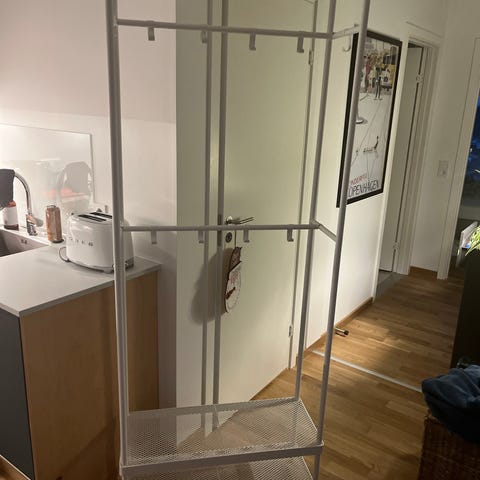 Tøjstativ med tre hylder bøjlestang og kroge. Er skilt ad.