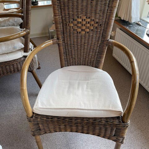 Disse flotte fletstole med høj ryg og træ ben giver øjeblikkeligt rummet karakter og ro. Perfekte omkring spisebordet – både til hverdagsmiddage og lange aftener med gæster.