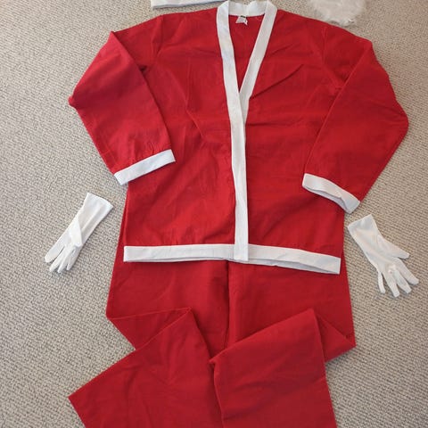Komplet julemand. Bukser med snor. Jakke. Skæg. Nissehue og gavesæk.