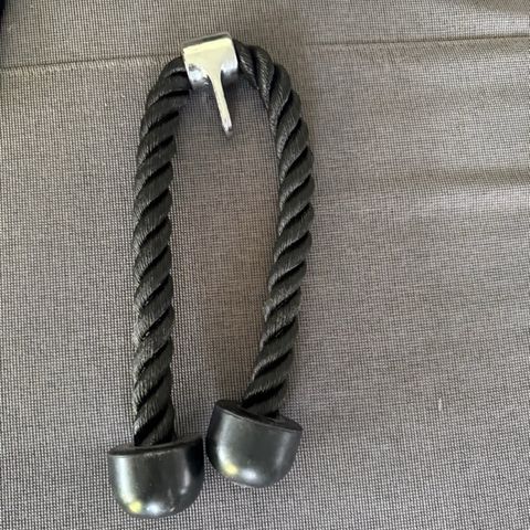 Gorilla Sports Triceps-reb i sort nylon med gummihåndtag, længde 68 cm. Designet til effektiv træning af triceps, biceps, skuldre, bryst og mavemuskler ved brug af kabeltrækningsmaskiner. Inkluderer forkrummet drejemekanisme (swivel) for fleksibel bevægelse under træning.