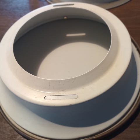 ARNE JACOBSEN. Louis Poulsen, loftslamper / væglamper, Munkegaardslampen, af metal, bakelit og porcelæn, opalglas, Danmark, designet i 1955. Med kant af børstet aluminium. Jeg tror mine lamper er produceret i 60'erne, da rummet, de har været monteret i, blev renoveret der.