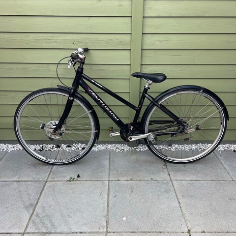 Bycykel af mærket Felt (ikke Centurion). Model Black hornet, Virkelig tjekket med lædersæde og sædetaske af læder. Med hånbremse, frontlad, skærme foran og bagved, cykellås og lygter. Den kører OK (skærmen skal strammes/løftes), men det kan dog godt ses og mærkes, at den er mere end 10 år gammel