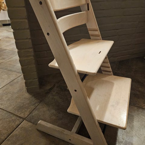 Stokke Højstol i lyst træ. Højstolen har justerbar sæde- og fodplade for tilpasning til barnets vækst. Designet til børn og lavet af holdbart lyst træmateriale.