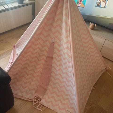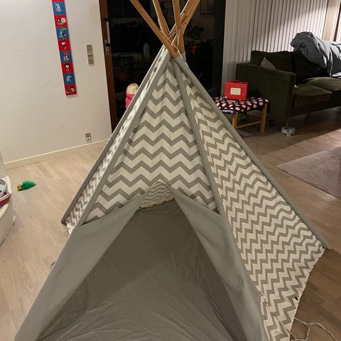 Alice & Fox børnetelt/tippi med zigzag-mønster i grøn og hvid. Teltet er designet til børn og kan bruges som legerum eller hyggested indendørs. Vi har få sommerdage også brugt det udendørs. Der hører ikke underlag til, så der skal man lægge et tæppe. Jeg har to tippier i alt sf forskellig mærke.