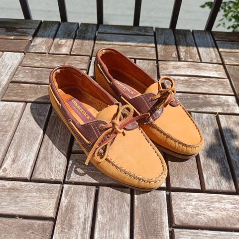 Klassiske sailorinspirerede herresnørresko fra Timberland, model Boot Company. Skoene er udført i lystbrunt ruskind med dekorativ lys stikning, hvilket giver et tidløst maritimt udtryk.