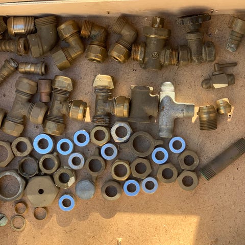 forskellige VVS-komponenter og værktøjsdele. Indeholder metaldele, koblinger, fittings og andre små reservedele til VVS.