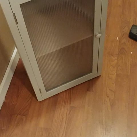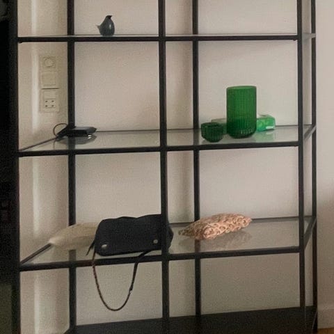 Glaslåger og reol er i fin stand.