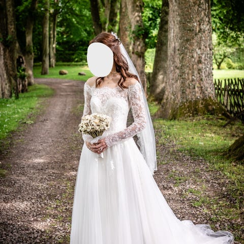 En Smuk blonde brudekjole brugt en gang med et flot slæb.