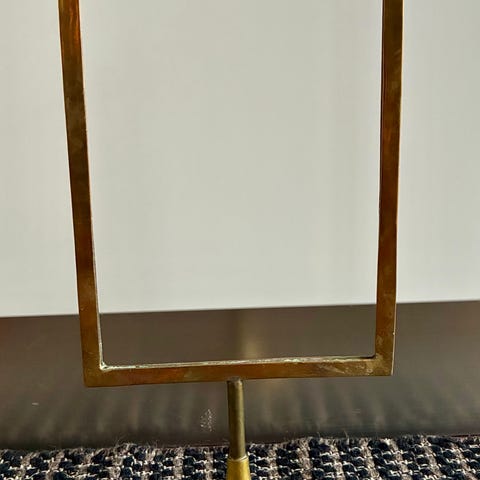 Menukortholder i messing, som er 30cm høj, mens selve menukortet af pap på 10m x 15cm er af pap, som bare isættes/udskiftes via åbningen øverst.