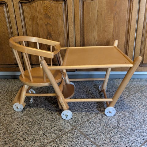 En god gammeldags højstol, som barnet sidder rigtigt godt i. Stolen kan klappes sammen så det bliver stol med legebord (se foto).