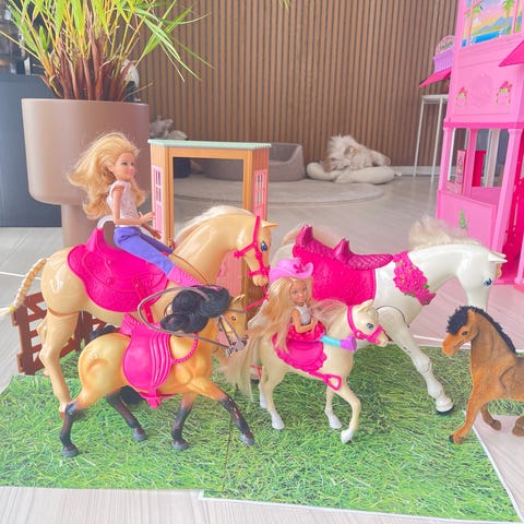 Barbie legetøjssæt med flere hestefigurer og tilbehør. Sættet inkluderer heste i forskellige størrelser med sadler og seletøj samt tilbehør som hegn og plejeudstyr.