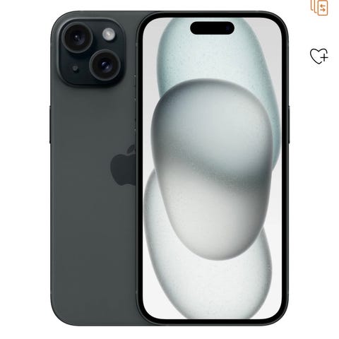 Apple iPhone 15 6,1" smartphone med 128 GB lagerplads. Enheden har en sort farve og leveres med original emballage og et sort cover. Telefonen har et moderne design med dobbelt kamera på bagsiden.