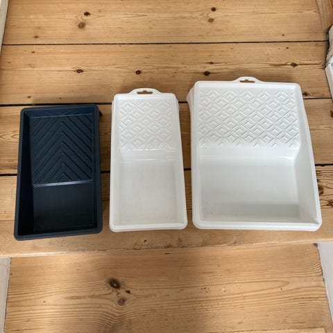 3 malerbakker gives væk. Indvendig bredde 28 cm. Den ene er brugt som det kan ses på billedet.