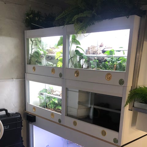 Jeg har en stører samling Lanzo terrarier der skal sælges da jeg stopper med at have krybdyr. De har alle individuel termostat og har installeret strålevarme. På billedet er der 2 typer. De store i bunden og de mindre i toppen. De små i toppen er tilgengæld 80cm i dybden. Pris på de store er 2500kr stk. og for de lave er prisen 1800kr stk. Ved køb af 4 eller der over kan vi lave en go samlet pris..