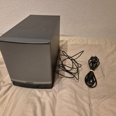 Bose subwoofer med tilbehør, herunder kabler. Produktet er velegnet til brug i lydsystemer for forbedret baslyd. Vægbeslag medfølger. Trænger til en kærlighånd :-)