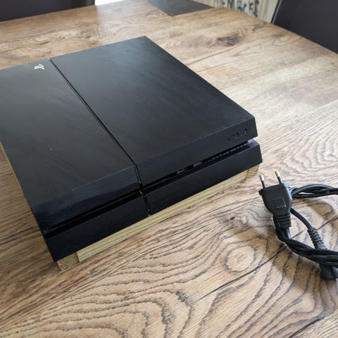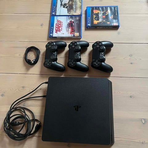 Sony Playstation 4 spilkonsol i sort farve. Konsollen har standard porte til tilslutning af controllere og andre enheder. Medfølger to trådløse controllere i sort og rød farve + smart opladerstativ. Designet til hjemmeunderholdning og gaming. 3 spil inkl. "Call of duty", "Need for Speed" og "Fifa14". Spillene kan købes særskilt for 75,-/stk. PS4. Alt sammen blot lidt brugt.