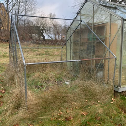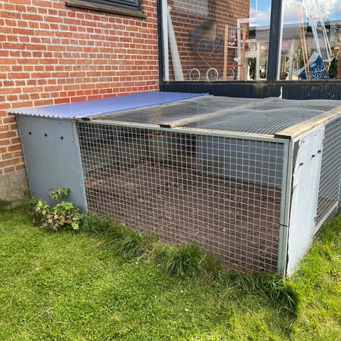 Løbegård brugt til kaniner. Kan sagtens bruges til høns målerne er 3 × 4 × 2.