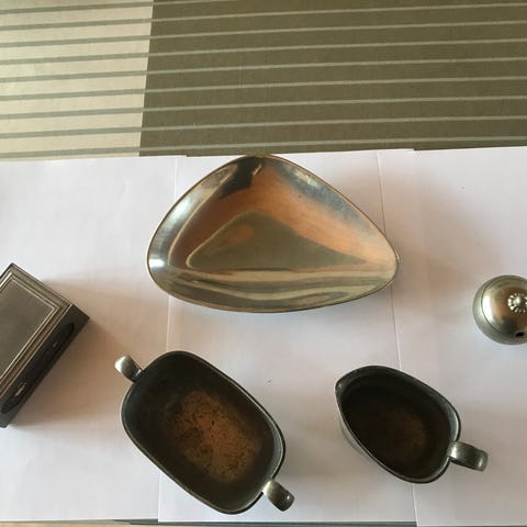 Tin, Husholdningsæske holder, Just Andersen, Just Anders tin. Tændstikæskeholder til husholdningsækser, stemplet og med modelnummer 1627. Måler 105x6,5x4,5 cm