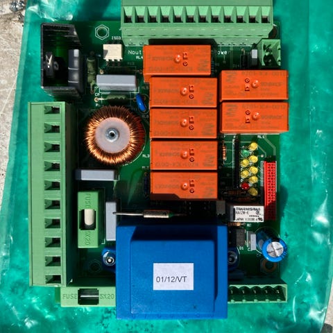 Elektronisk printplade med flere tilslutninger og komponenter. Indeholder forskellige stik og kredsløb til elektronisk styring og signalbehandling.