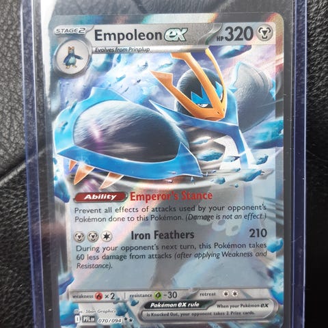 Empoleon V Pokémon kort med 210 HP, del af Rapid Strike serien. Kortet har evnen Emperor's Eyes og angrebet Swirling Slice, som kan flytte energi fra dette Pokémon til dit Pokémon. Velegnet til samling eller spil.
