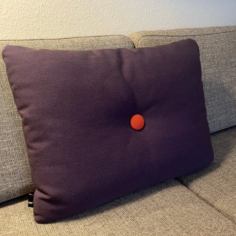 Aflang Hay dot pude i det klassiske uld stof. På den ene side gule knapper, på den anden side lilla