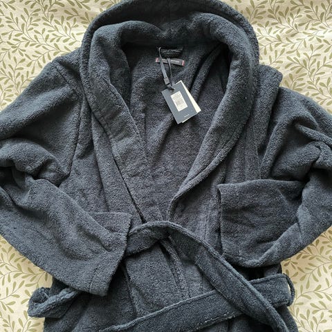 Hooded bathrobe, 100 % cotton, navy blue. Soft, cozy, long. Bought on Amazon, forgot to return in time. Brand new with tags.